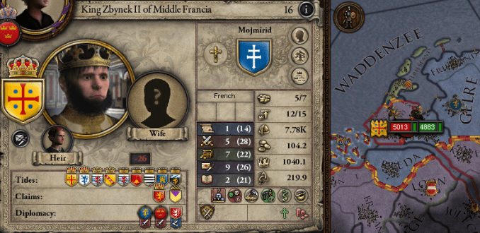 この時代、長らく同君連合にあった国が分裂すると悲惨である。国内の婚姻関係と継承によって相続権・請求権は複雑に入り乱れ、再統合を目指しての戦乱と陰謀の嵐が巻き起こる。それは、中フランクとバイエルンに於いても例外ではなく、ウラジミールは中フランクへの請求権こそ持たないものの、国内には中フランク内の様々な称号への請求権を持つ人物がおり、開戦事由には事欠かない状態であったのだ。 ウラジミールは家臣の宮中に下ロレーヌ公位への請求権を持つマルグリット・ザーリアー(当時の下ロレーヌ女公・アルベラデ・ザーリアーの大叔母)を見つけると、その請求権を行使。1050年中にバイエルンと中フランクは開戦に到る。