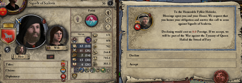 この直後から、東方のノルド世界が騒がしくなる。 最初は、"フレイの剣"ハフリド女王の支配するリトアニア王国で、スカロヴィア族長・フローニ氏族のシグルドが起こした反乱に対する援護要請である。