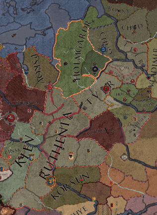 上画像資料は左図が1054年初頭の、右図が12年遡って1042年(つまりギュリドによる東方領域分離から約1~2年後)の、ホルムガルドとその周辺勢力図である。 1042年当初には地図の中にすらないルテニア王国の躍進によって、南方の版図を大きく喪失しているのがわかる。一体ロシアに何が起こったのか?