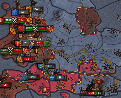 驚くべき事に、これは帝国本隊の最大動員力すら優に上回る員数で、仮に盟主が本格的にウェールズ戦役に介入したとしても、これまでの様に必勝とはいかない状態となっていた。そこで、民会は「とりあえず」の案として、兵員補充に多大な金額が掛かる為にインガの代に規模を縮小されていた常備軍の再拡充を考える。その財源として、イングランドで徴収兵を集め、イングランド総督・ボトゥルフを援護するついでに、ウェセックス王国で略奪を行う、という方針が決まった。