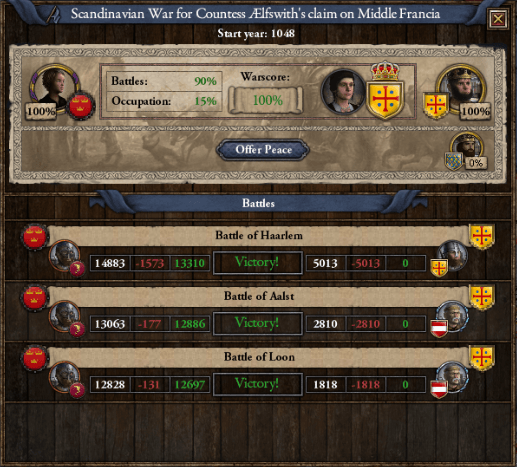 ハールレム会戦以降は決戦らしい決戦もなく、スカンジナヴィア軍はフリギア内の中フランク領を占領。 1050年の2月頃、終戦直前に西フランク王・ギーグ3世が援護の声明を出したが、その頃には既に大勢は決しており*1、ルーン会戦で残存兵力を蹴散らされた事を切っ掛けにズビネック2世はエルフスウィスへの中フランク王位の禅譲を決定した。フリギアの領土と、ロタンギリア(中フランク)の中でもズビネックの直轄地とされている地域は、ズビネックに残されたバイエルン王冠の支配下に残される事となったが、これによって中フランクとバイエルンの国力は大いに低下する事となる。