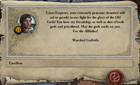 しかし、正教戦士達の蛮族への怒りは尚も治まらず、スヴェンが焦ってウラジミールを獲得しようと聖戦を開始したのを知ると、その横っ面を殴りつける様にして、ホルムガルドを求める聖戦に到ったのである。