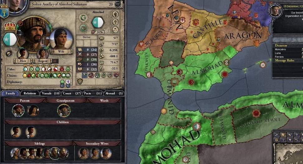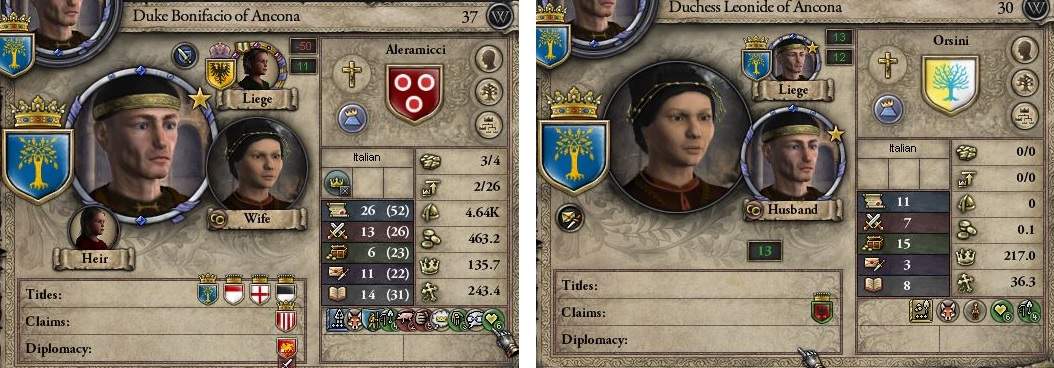 元々持っていた「勤勉」かつ「野心家」に加え、エルサレム巡礼の際に「社交的」「慈善」「親切」をゲットというミラクルを引き当てた。 外交値26とは生きながらにして既に聖人の風格すら見える。彼の神殿を建てよう。 ――もっともこの半年後、ランダムイベントで「勤勉」が消失してしまった。まあ、早々良いことばかりは続かないということだろう。