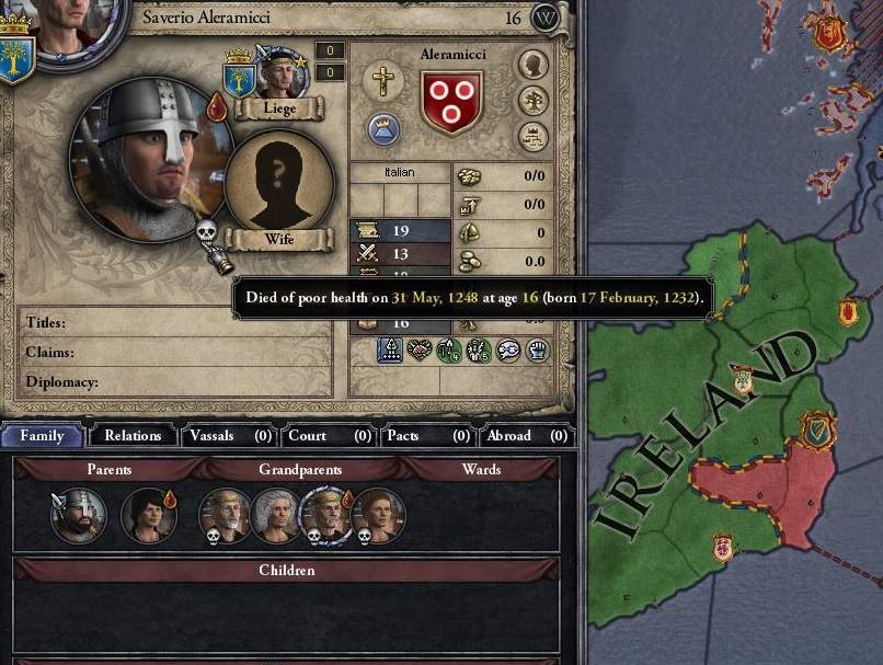 同じく男子を産んでいる先代グリエルモの五女、あるいは後継選挙の対抗馬の誰かあたりによる暗殺の可能性は大きいが、証拠は上がらなかったようだ。 いやちょっとこれマジで勘弁してください。後継者どないするねん。アイルランド王国が頑張ってるのが吹っ飛ぶレベルの驚愕ですわ。 これだからCKは・・・・!!!!