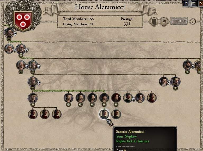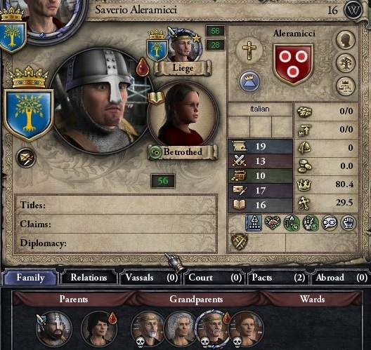 36歳にして3人の子宝には恵まれたものの、全員女子である。なお次女はHRE次期皇帝*1との婚約を済ませている。 幸い、妹の息子=甥が「天才」持ちで順調に育っており、フランス王女との婚約も済ませている。 よほどの事がなければ次の当主はこの天才サヴェリオになる。そのつもりで準備もしていこう。