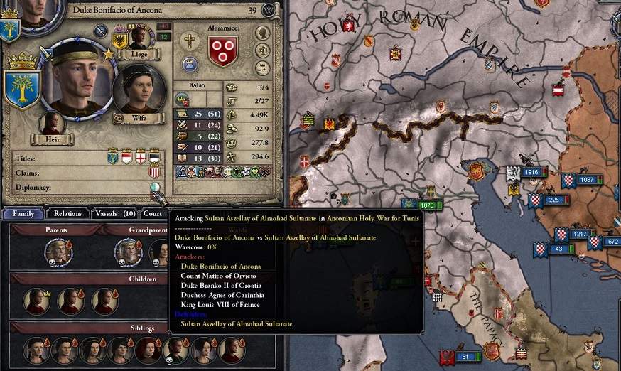 が参戦を表明した。ヘタな十字軍より十字軍してる陣容だ。その総数は25000を超える。何6割がフランス軍? 気にすんな。 なお、呼びかければバイエルン公と上ロレーヌ公とも、先代同様に同盟を結べるが、海に面してないので今回は見送っている。
