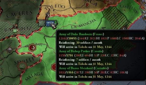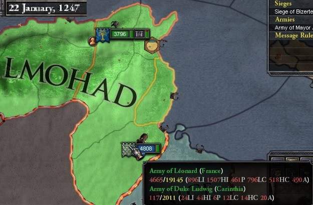 さて、ムワッヒド軍6000に対し、チュニジア攻略十字軍(仮)は総数25000。これは楽な戦だろう・・・ と思っていたのが、そうは問屋が卸さないのがCK2の世界である。 まず困惑したのがフランス軍他同盟軍の奇怪な挙動だ。