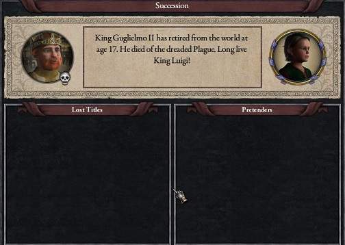 こう書いた家だが、実はこの後、エピルス公58歳にして跡継ぎの男子に恵まれていた。 やむなく男子を暗殺しようとするも、plot powerが全く足りず、我が家臣による継承は見事御破算となっていたのだ。