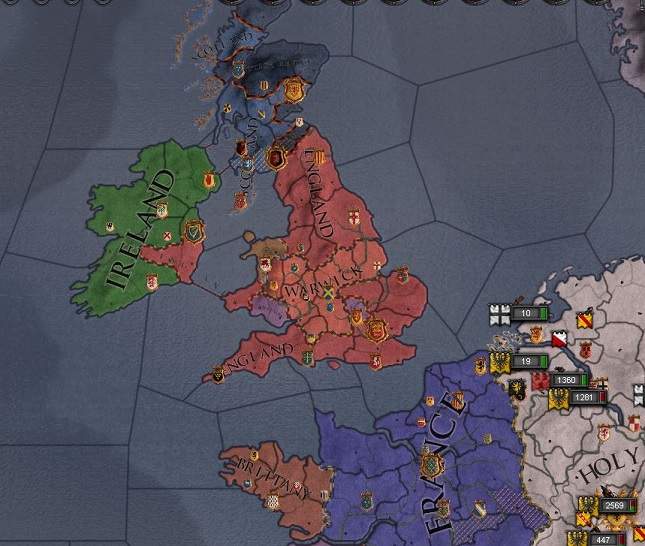 イングランドの分裂は相変わらず。小伯家は消滅し、ワーウィック公領とアキテーヌ王国が手を組んでイングランドに対抗している形。 ただ、そのアキテーヌもフランスにジワジワde jure宣戦でで削られているので、意外と先は長くないかもしれない。