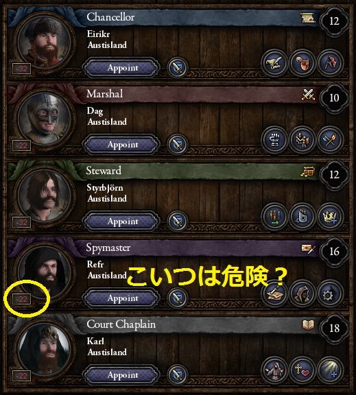787年 このころ評議会は皆opinionが+30くらいあったが、新しく貰った側室を密偵頭にしようとするが、クリックミス?で失敗