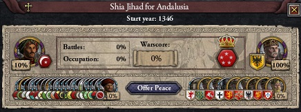 防衛戦争は信仰値や威信値は獲得できるものの、領土的なメリットは存在せず、効率の悪い戦争になりがちですが、近隣国への侵攻と抱き合わせることでこの点をカバーできます。また、今回の場合、ジハードの裏で聖戦を仕掛けることで、聖戦に多くのイスラム国家が参戦してくる事態を防ぐ効果も期待できます。