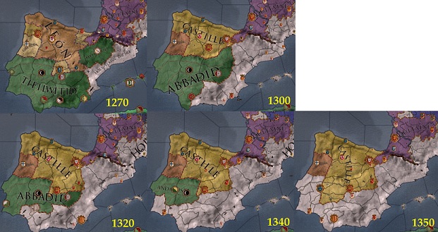 13世紀の間は神聖ローマ帝国によるアラゴン王国の獲得がメインで西方ではイスラム教側がやや優勢だった。 レオン、ガリシア、ナバーラなどの国家は抗争を繰り広げ、カステーリャとポルトガルの2王国に収束した。 14世紀に入ると、神聖ローマ帝国が海岸線沿いに勢力の拡大を続けるとともに内陸部はカスティーリャ王国が獲得した。