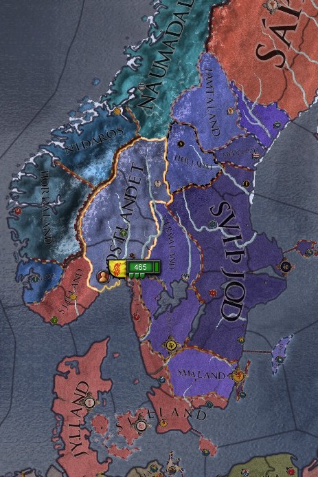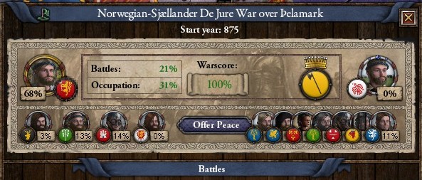 06_knud.jpg ノルウェーのDa jureに領域を持つ彼らはいずれ戦わねばならない相手である 王になるまでの間に英雄の息子が死に、動員兵力も弱体化している今、Haraldrが宣戦しない理由は無かった しかしさりとて英雄の孫で大族長である 彼の側には多くの族長が付き、戦いは苛烈なものであったが…