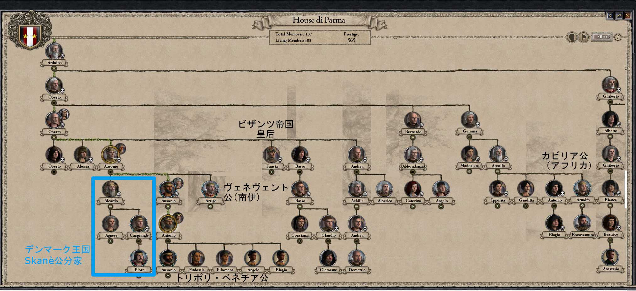 先王の妻がパレスチナ出身だったことで息子、孫が中東系の風貌となり、いかにもアフリカ王といった趣だ。 アントニオ自身もエチオピア人の妻を娶り、アフリカ王のアフリカ人化がますます進行するであろう。 アントニオは先王の祖父アウソニオに比べると随分好戦的であった。 1183年、神聖ローマが代替わりの反乱起こしたので、早速臣下のクレームを使い便乗宣戦。 万の兵で速やかに強襲を行い、反乱諸侯が皇帝と和平する隙を与えず降伏させ、フィレンツェ州を獲得。