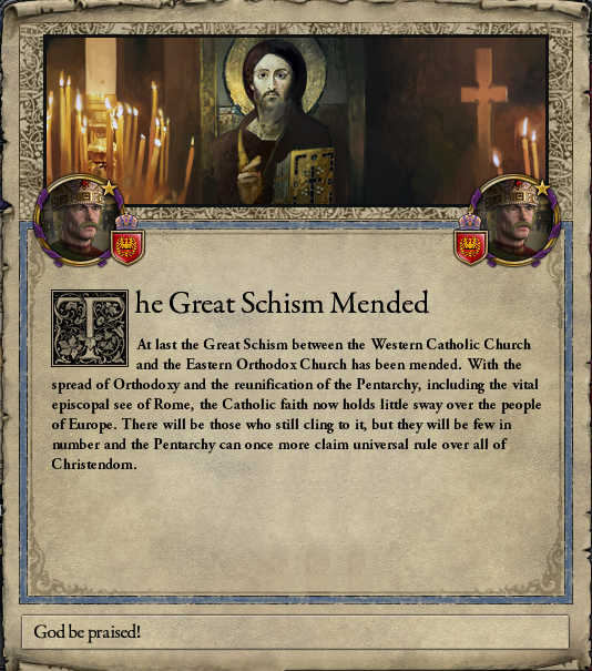 東西教会の大分裂は、東方典礼の拡大と五大総主教、 ことに重大な聖都たるローマ総主教の再結集によって修復された。 未だ西方異端を奉じるものもいるがそれは最早少数であり、 総主教は今や再び全キリスト者を指導することができるのだ。