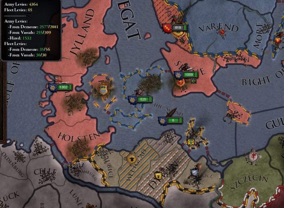 デンマーク王スヴェン2世は片足を失うわ、総兵力が2000少しに打ち減らされるわと、かなりの打撃を被っている。 我がウプランド公国は、伯領4つを直轄してその兵力は2500にまで向上。傭兵を1500も雇えば充分勝てる。