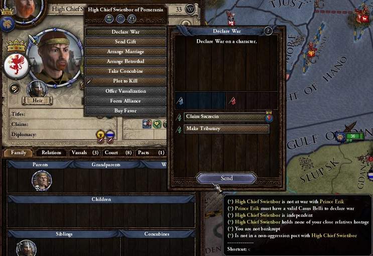 バルト南岸、スラブ教徒のポメラニア公国に宣戦する。 コンクエストCBを海の向こうにも使えるというバイキングの特性は、一神教が相手の場合だけで、 多神教が相手の場合は、海越えでは服属CBか属国化CBしか使えない。 服属CBでポメラニア公号を奪い、後にシチェチン伯を剥奪、とするのも考えたのだが、 分割相続である以上複数の公号を持ちたくないことから、請求権捏造でのピンポイント攻撃とした。