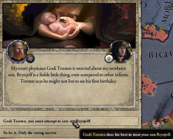 宮廷医師にか弱い息子を何とかしてくれと頼むイベントが発生した。 下の「強いものだけが生き残るのだ」を選んでも良かったが、初のイベントなので上の選択肢で何が起こるのか見てみる。と。