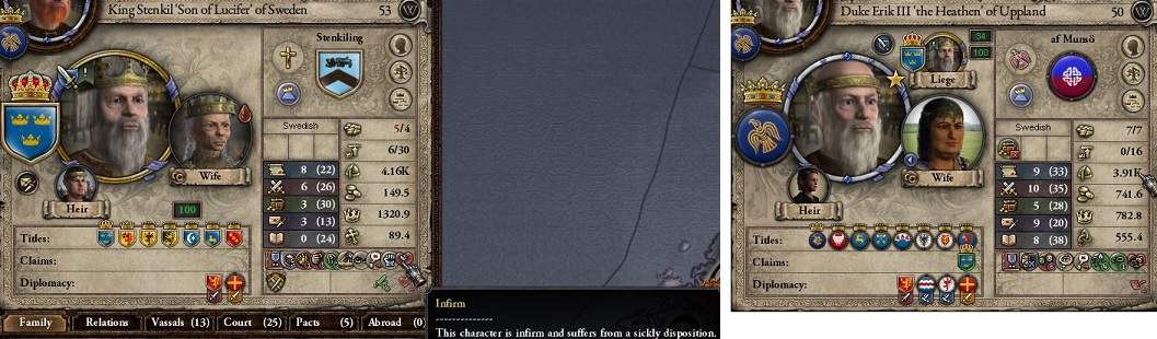 スウェーデンVSノルウェーの戦が続く1080年、エリック公は50の坂に乗った。 一方スウェーデンのステンキル王は53歳、infirmが入ってもう3年になるが、なかなか死んでくれない。*1