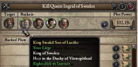 ステンキル王自ら陰謀に参加。 なんですか若い嫁でも欲しいんですか? が、他に賛同者が少なく、plot powerは100%をギリギリ越えるか越えないか程度。暗殺は一向に成立せず、 エリック公死ぬなー! と祈りながら時間をひたすら進めていく他なくなった。