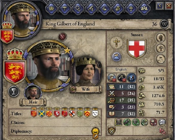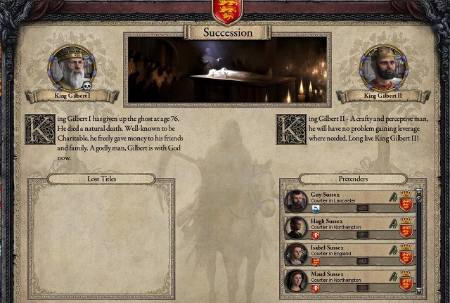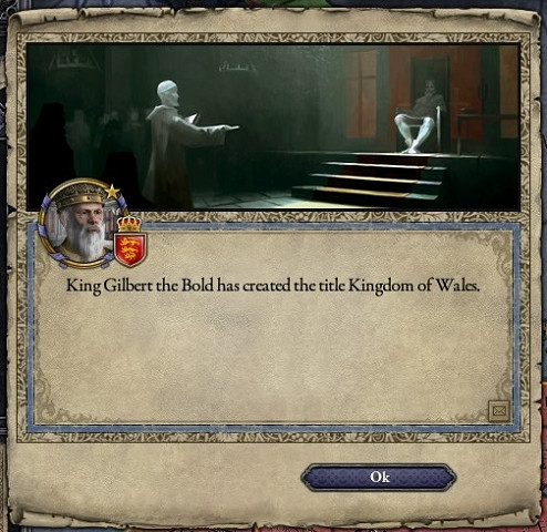 西暦920年12月22日、イングランド王ギルバート1世大胆王はロンドンの宮殿で崩御した。享年76歳、自然死であった。 彼の治世は40年にも及び、彼はその間に7度の外征と2度の内戦を制したため、民衆の間から"The Bold 大胆王"と呼ばれ称賛された。しかし、近隣のウェールズ人やアイルランド人には対照的に侵略者として恐れられた。 ギルバートは、その治世の間にこれから対外政策の主柱になる対ウェールズ・アイルランド拡張、対フランス協調を決定づけた点でも称賛されている。 そして、王位はギルバートの長男の長男であるギルバートが継ぎ、ギルバート2世として即位した。