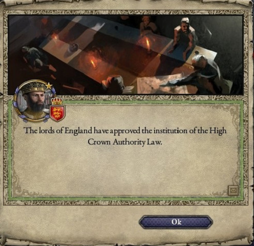 そのすぐ後、ギルバートは王権強化の法案を提出し、西暦883年8月15日これが認められ、王権法がMediumからHighに上昇した。 この時、諸侯を懐柔するため多額の金銭がばらまかれたという。