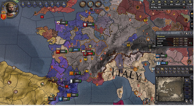 西暦921年5月21日現在のフランス地方 東フランク王国が拡大している。対して西フランク王国は先の十字軍でアキテーヌを獲得した。