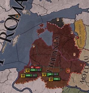 賢帝ErichはEre Kukkのリトアニア女王即位を求めて兵を挙げ、半年の間にリトアニア南部を制圧した。 リトアニア王Raakは白旗を揚げ、Ereはリトアニア女王として戴冠した。 しかし、その戴冠式に出席していたErich帝は信じられないことを口にしたのだった。   erich.jpg Ere女王は身重です。とても女王の任は務まらないでしょう。王位に相応しいのは彼女ではない。Ihanti密偵長なのです! ere3.jpg なんですって!!!   ErichはすぐさまEre女王に対する宣戦を布告した。皇帝が後継者に指名した人物は帝国に心中しているノルウェー王の領内の伯爵の廷臣、Ihanti Hamalainenだった。皇帝は一度撤収させていた軍隊を再度編成し、リトアニア王国領に進軍させた。女王に就いたばかりのEreが憤慨したのも頷ける。なにせ、つい昨日まで自らの王位を主張して戦争をしていた頼るべき盟友が突然、刃を向けてきたのだった訳だから。   surrender.jpg   Ereはまったく何の抵抗もできないままに降伏した。それは、1452年12月のことだった。   europe.jpg
