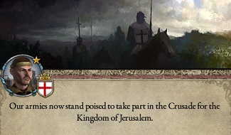 王位は十字軍への貢献度によって争われますが、仕様はやや複雑です。キリスト教徒の王位請求者が存在する場合は、そのうちの誰かが王位につきます。十字軍にもっとも貢献した勢力の関係者(同王朝、臣下など)がいれば、その人物が国王に就きます。キリスト教徒の王位請求者が居ない場合は貢献度の最も高かった勢力の領主が戴冠します。