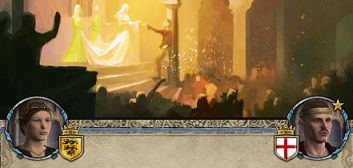 さて、ここで現実世界のシュヴァーベン大公について少し話しておきましょう。シュヴァーベン大公はもともと在地貴族としての性格が強かったのですが、ハインリヒIV世のころに歴史の表舞台に登場します。ハインリヒIV世は教皇に破門され、これはカノッサの屈辱に至ることとなるのですが、破門された皇帝にはもはや正当性がないという主張のもと、対立王としてドイツ王を名乗ったのが当時シュヴァーベン大公にあったラインフェルデン家のルドルフだったのです。皇帝側は対立大公としてホーエンシュタウフェン家のフリードリヒを擁立し両者の争いが続きましたが、最終的にはホーエンシュタウフェン家が勝利し、敗れたルドルフの子孫(女系のため直系ではありません)は「ツェーリング大公家」を名乗っていくこととなります。 フリードリヒはハインリヒIV世の娘・アグネスと結婚しており、ハインリヒV世が継嗣なく死去し、ザーリアー朝が断絶すると女系の血族であったシュヴァーベン大公家(ホーエンシュウフェン家)は帝位の後継候補となりましたが、結局はザクセン公・ロタール=フォン=ズップリンブルクがドイツ王に選出されました。このロタールは即位の時点ですでに50歳と高齢で、かつ継嗣もありませんでした。このため、自らの後継者として娘の嫁ぎ先であるバイエルン公ハインリヒX世を望んでいたといいます。ところが、彼の死後になると、バイエルン公とザクセン公を兼ねる強大な皇権の出現を嫌った諸侯はこれに反対し、ホーエンシュタウフェン家のコンラートが次代の皇帝に選出されたのでした。これが神聖ローマ帝国におけるホーエンシュタウフェン朝の始まりになります。(イタリア統一を夢見たフリードリヒII世などを輩出しました。) さて、シュヴァーベン大公位に戻り、もう一度歴史を眺めていきましょう。ホーエンシュタウフェン朝が崩壊すると、シュヴァーベン大公位もホーエンシュタウフェン家の元を離れました。一方で、ツェーリング大公家はその後もひっそりと断絶せず続いていたようです。ハプスブルク家初のドイツ王となったルドルフI世は母方の曽祖父にツェーリング大公ベルトルトIV世を持ち、ツェーリング家の直系男系が断絶したこともあり、ハプルブルク家は名目上、シュヴァーベン公位も手に入れています。 ルドルフI世の死後、彼の遺産は息子であるアルブレヒトとルドルフII世とが(半々ではないにせよ)分割して相続するよう取り決められていました。ところが、ルドルフII世の早世もあり、兄のアルブレヒトが一括して土地財産を管理していました。このことに不満を覚えていたルドルフII世の遺児ヨハンは1308年、ドイツ王アルビレヒトを暗殺します。そして、この事件以後、ハプスブルク家は一時的に勢力を縮小することとなったのでした。この後長きに渡ってハプスブルク家内でヨハンの名前が忌避されたと伝えられていますが、それと同じようにヨハンが(実権の伴わない称号として)帯びていたシュヴァーベン大公位を敢えて名乗る人物も現れず、ヨハンが歴史上最後のシュヴァーベン公とされています。 シュヴァーベン公位は、ホーエンシュタウフェン家とハプスブルク家という神聖ローマ帝国を代表する2つの王朝に関連しています。何はともあれ、シュヴァーベン公位の獲得は縁起の良いものではありそうです。 なお、本プレイでのシュヴァーベン公はハインリヒIV世が破門を受けず、そのため、ラインフェルデン家は対立王とならず、ホーヘンシュタウフェン家が擁立されることもなかったため、ラインフェルデン家によるシュヴァーベン公家がAgatheの代まで存続していました。