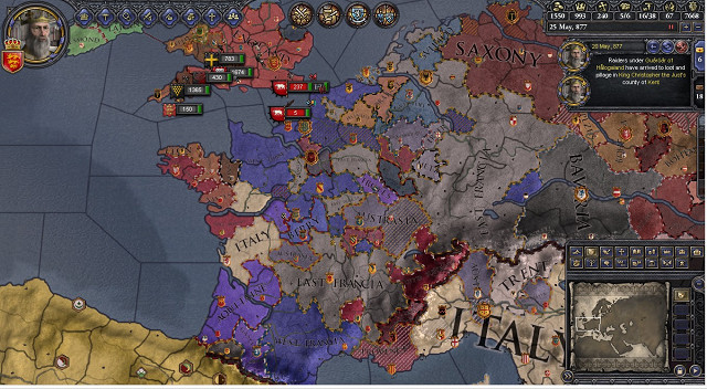 同じくフランス周辺の地図 ロンバルディア王国がイタリア王国に変わった。フランスでは東フランク王国が一歩抜けていて、それに西フランク王国、アウストラシア王国がつづいている。ほかにもアキテーヌ公国とベリー公国が頑張っている。