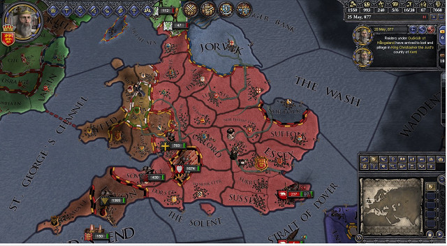 西暦877年5月現在のイングランド王国の領土。ウィッチェ王国の残りカスが邪魔だが南部イングランドをほぼ統一した。でもヨーク伯領までSVIPJODに盗られました。