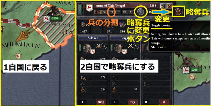 前回の続きからです。和平をせず略奪に行きます。略奪するためには自国に戻り略奪兵に変更する必要があります、自国に戻った後、黄色枠のボタンで変更します。オレンジは兵の分割。