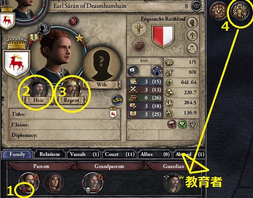 ついでに幼君について語ります。15歳以下は幼君です。黄色2番は後継者です(父を暗殺した憎き伯父)、黄色3番は摂政です、幼君は元々、行動制限が色々あります(法律変更できないなど)、さらにこの摂政と仲が悪いと幼君の行動制限がさらに強化されます。また資金を盗む摂政が多いので覚悟してください。 黄色4番は教育できる子供(6歳以上)がいる時に教育者がいないと出現します。 教育を受ける子供は教育者と同じ文化や宗教に変更する可能性があります(現在宗教は支配者の教育者にのみ変更可能だと思います(要確認))